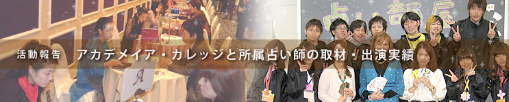 アカデメイア・カレッジと所属フォーチュンカウンセラー(占い師)の活躍をご報告しています。数多くの企業様にご依頼頂き、ご好評を頂いています。 占い師派遣や占いに関する各種取材はアカデメイアまでお問い合わせください。 |